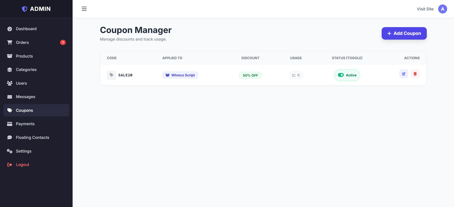 Coupon Code System: Create global or product-specific discount codes (Percentage-based).