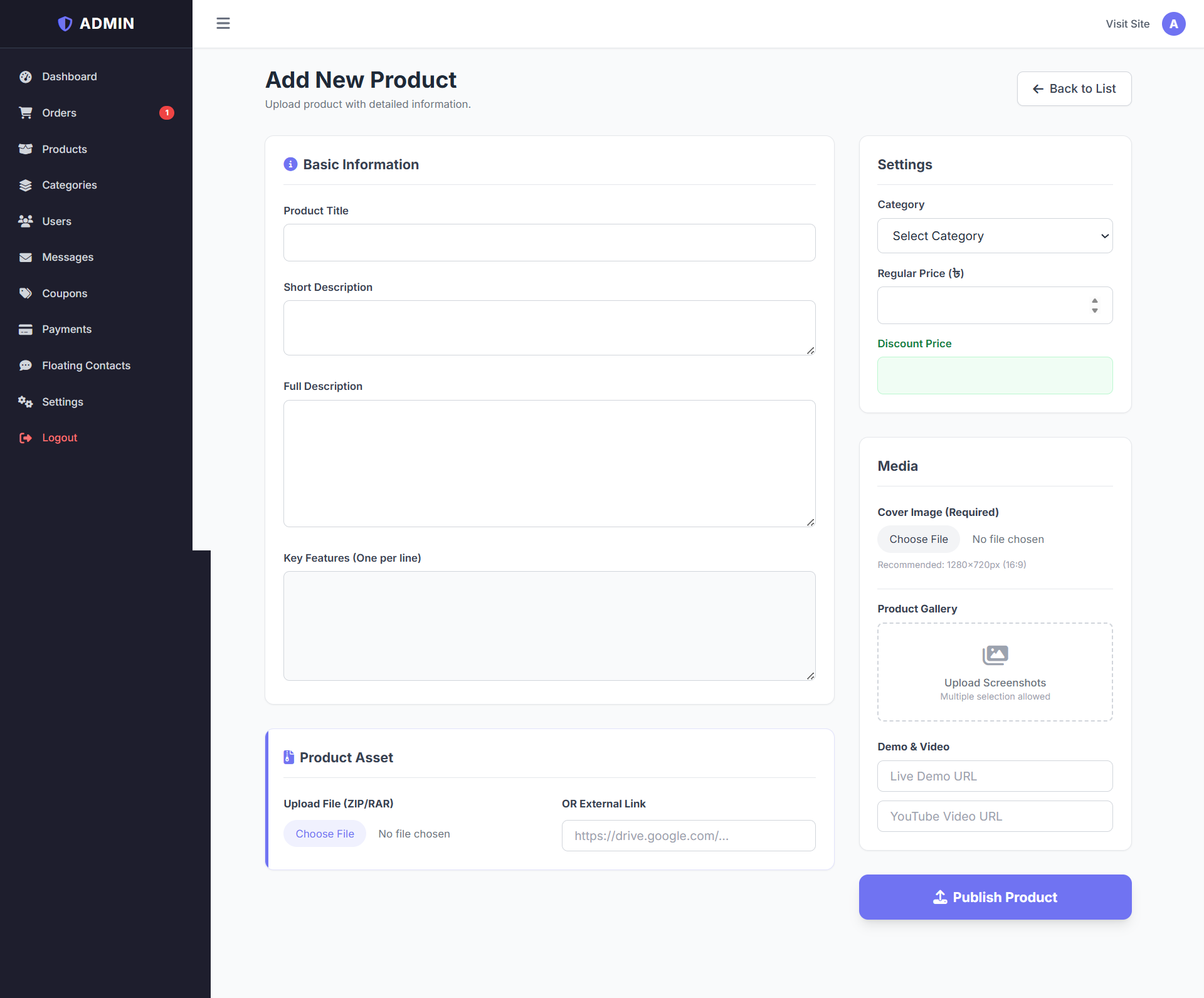 Upload digital files directly (ZIP, RAR, PDF) or use External Download Links (Google Drive, Mega, Dropbox).